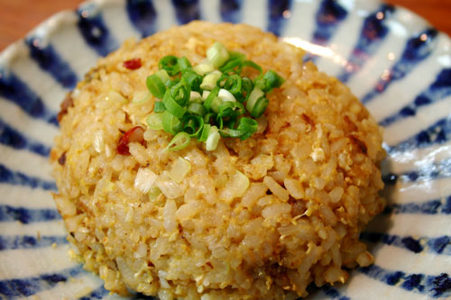一・熱したフライパンに油を引き、ほぐした卵を入れ、固まらないうちにご飯を入れ炒める。