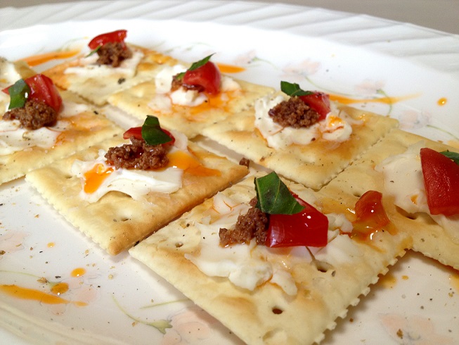 一・クラッカーにチーズを塗り、へしこ(ほぐしたもの)、トマト、オリーブオイル、ブラックペッパーをかける。
