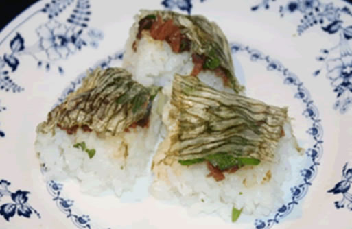 一・スライスしたへしこ(塩分が強いので少量で)、大葉、昆布の順で重ねて、押してなじませる。