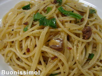 一・香りがでたらパスタ、パスタの茹で汁大2を加えてなじませる。
