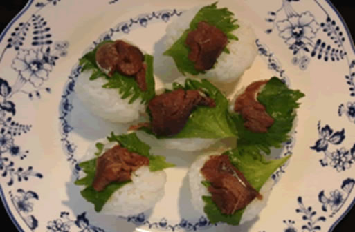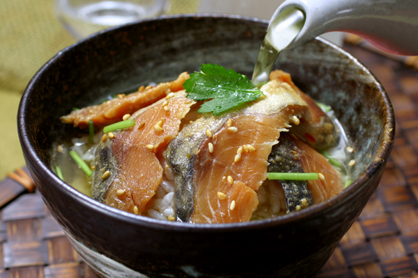 一・温かいご飯に薄くスライスしてサッと焼いた、へしこ、わさびをのせ、熱いお茶を注ぐ。